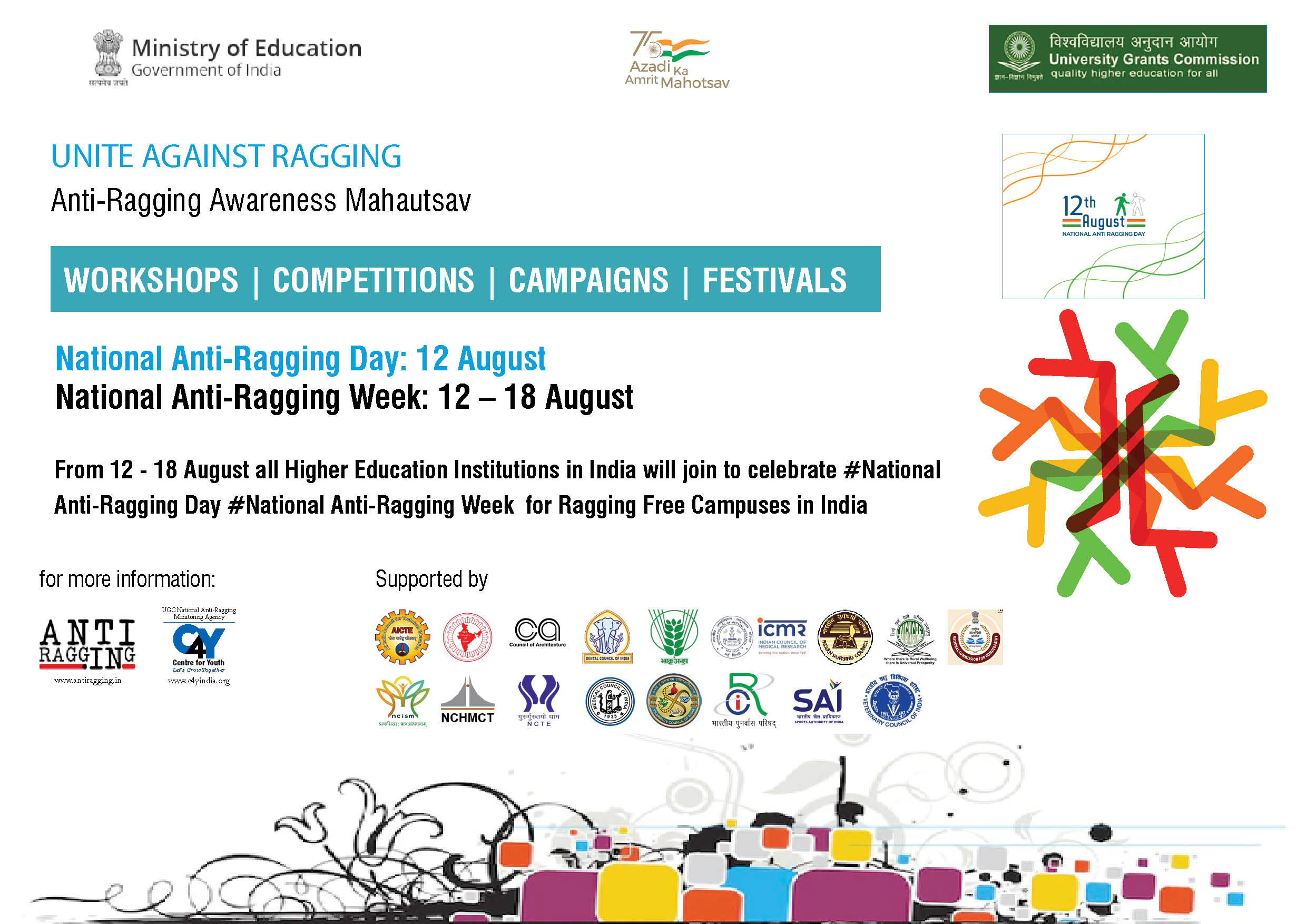 In observance of Anti-Ragging Day on 12 August, followed by Anti-Ragging Week from 12 to 18 August, the UGC and Centre for Youth (C4Y), the UGC National Anti-Ragging Monitoring Agency, suggest the following activities during these celebrations: