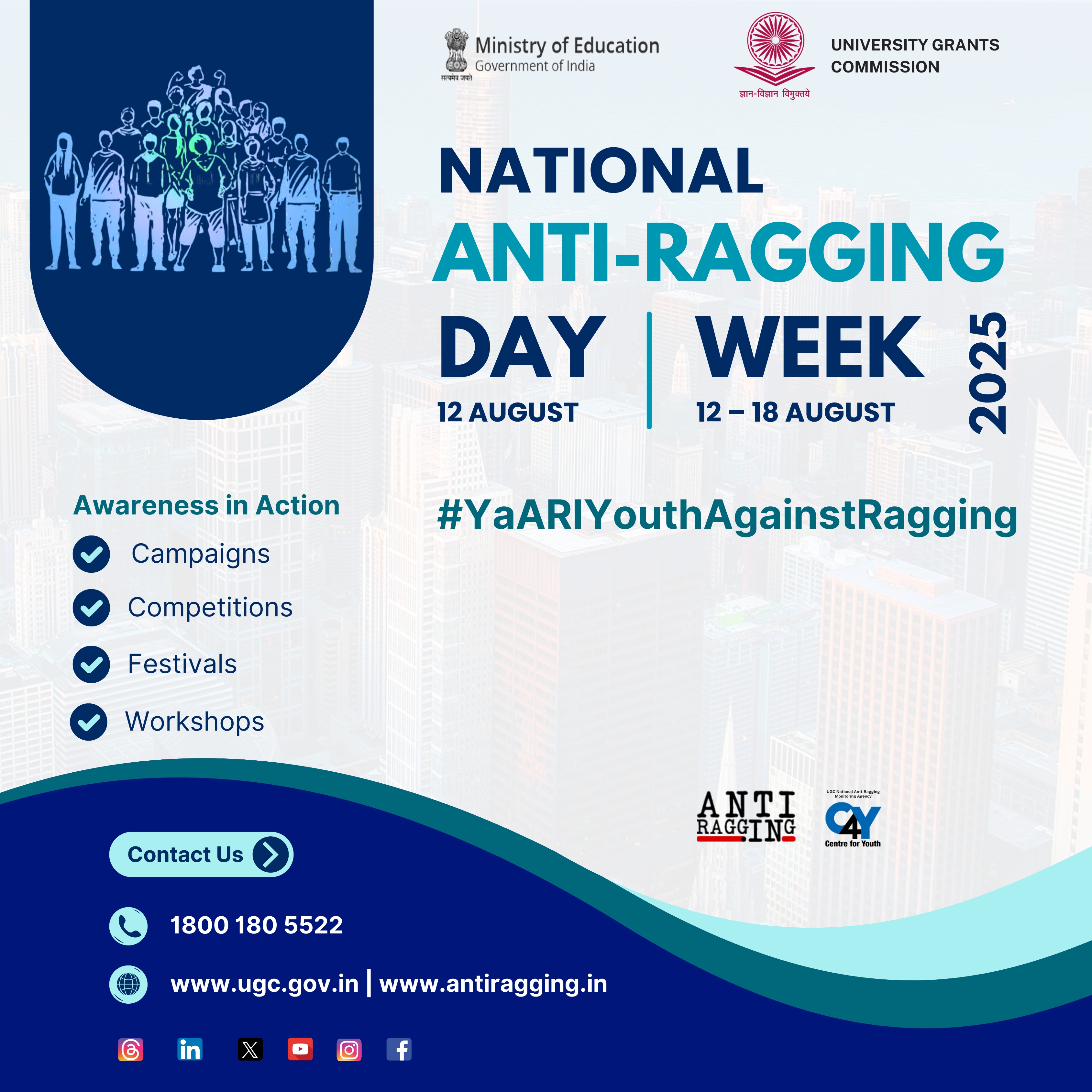 In observance of Anti-Ragging Day on 12 August, followed by Anti-Ragging Week from 12 to 18 August, the UGC and Centre for Youth (C4Y), the UGC National Anti-Ragging Monitoring Agency, suggest the following awareness activities: